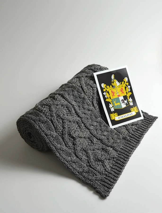 The O’Sullivan Clan Aran Scarf is a wonderful item of O’Sullivan heritage which will be cherished by the wearer for generations to come. Lovingly crafted from the finest 100% soft new wool, this Aran wool scarf has been created following the unique O’Sullivan clan Aran pattern.