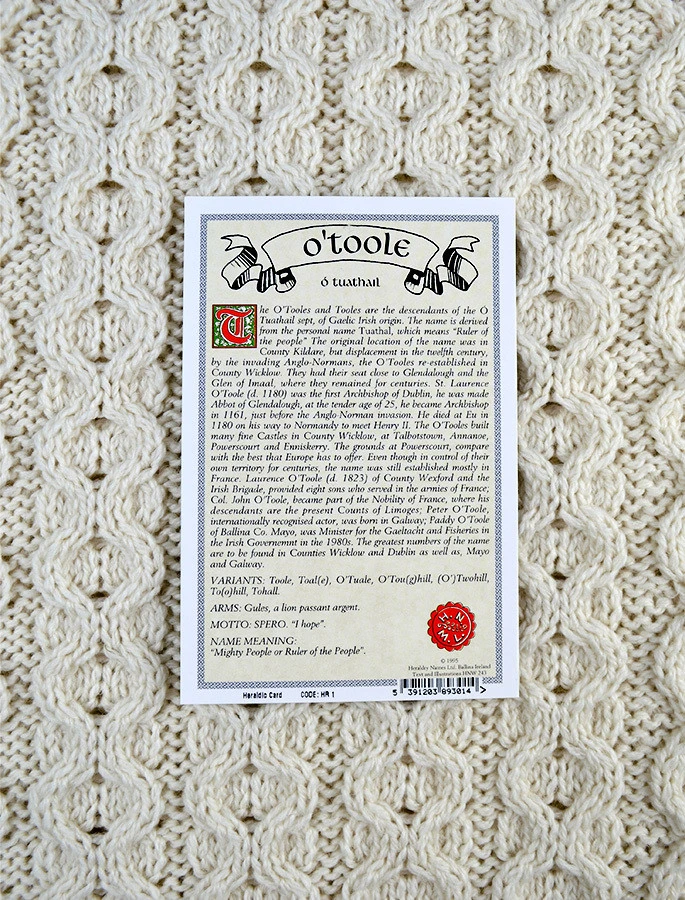 The O’Toole Clan Aran Scarf is a wonderful item of O’Toole heritage which will be cherished by the wearer for generations to come. Lovingly crafted from the finest 100% soft new wool, this Aran wool scarf has been created following the unique O’Toole Clan Aran pattern.