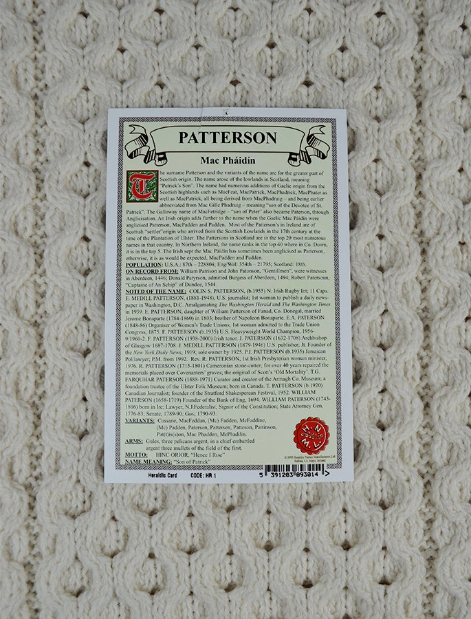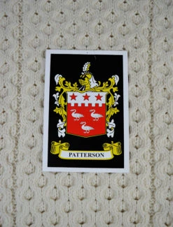 The Patterson Clan Aran Throw is a precious gift for any home wherein Patterson heritage proudly resides & will be cherished by families of the Patterson name for generations to come. Lovingly crafted from the finest 100% soft new wool, this Aran throw (measuring 64″ X 40″) has been created following the unique Patterson Clan Aran pattern.