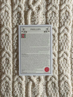 The Phillips Clan Aran Scarf is a wonderful item of Phillips heritage which will be cherished by the wearer for generations to come. Lovingly crafted from the finest 100% soft new wool, this Aran wool scarf has been created following the unique Phillips Clan Aran pattern.