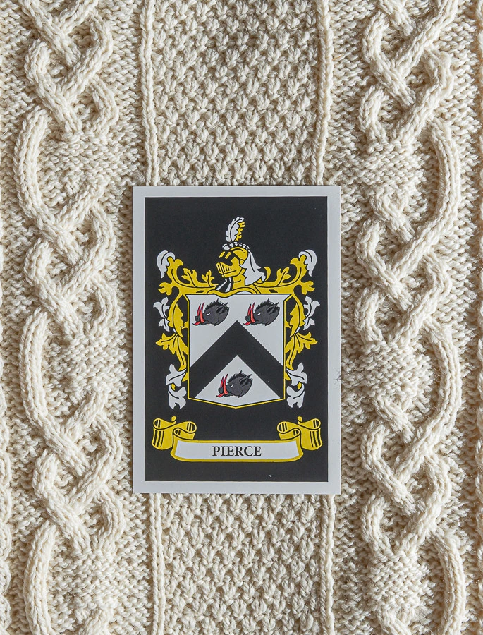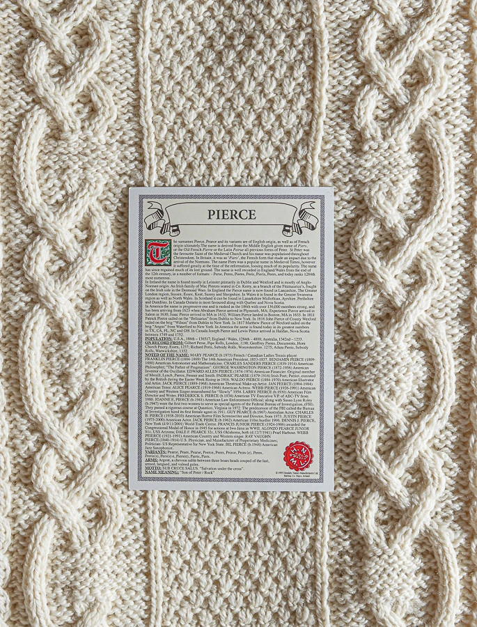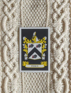 The Pierce Clan Aran Throw is a precious gift for any home wherein Pierce heritage proudly resides & will be cherished by families of the Pierce name for generations to come. Lovingly crafted from the finest 100% soft new wool, this Aran throw (measuring 64″ X 40″) has been created following the unique Pierce Clan Aran pattern.