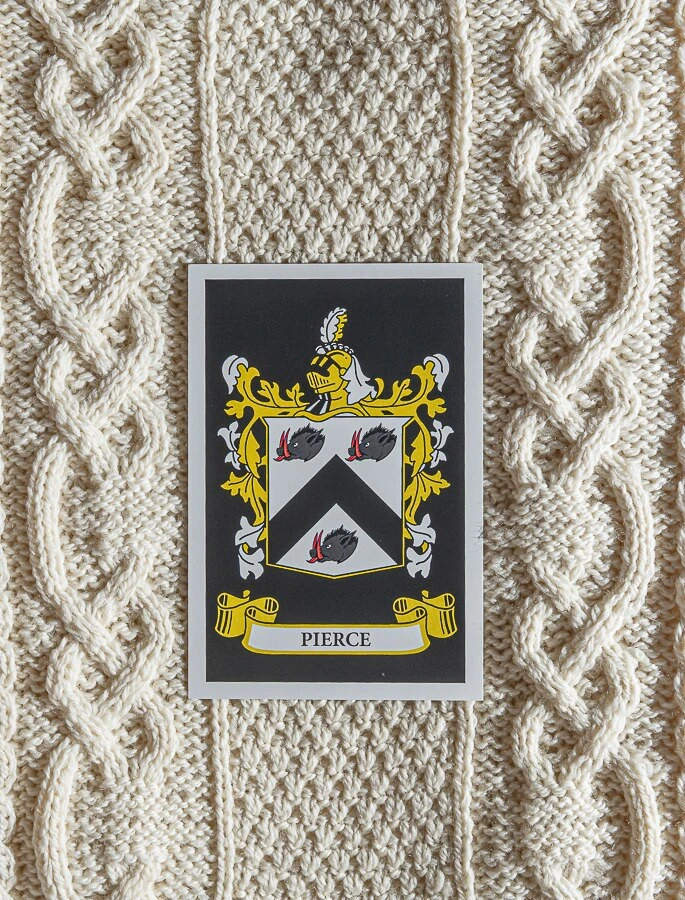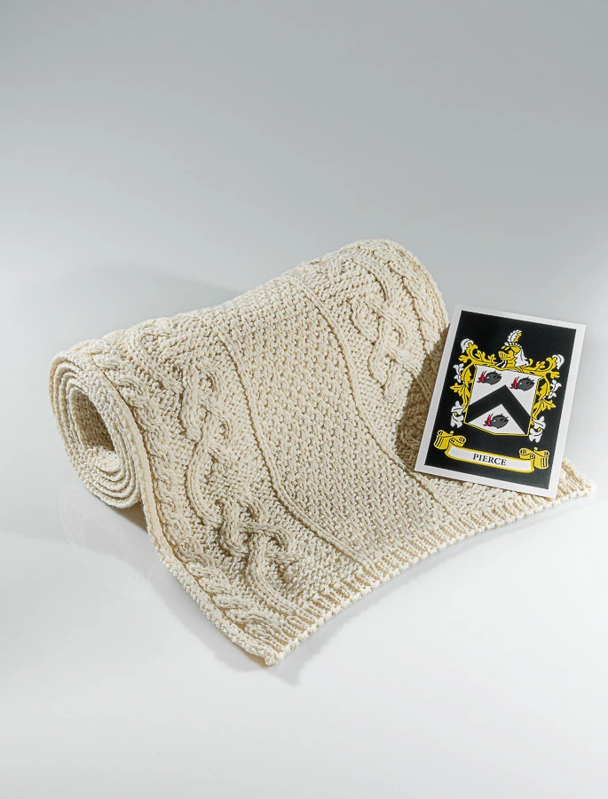 The Pierce Clan Aran Scarf is a wonderful item of Pierce heritage which will be cherished by the wearer for generations to come. Lovingly crafted from the finest 100% soft new wool, this Aran wool scarf has been created following the unique Pierce Clan Aran pattern.ย