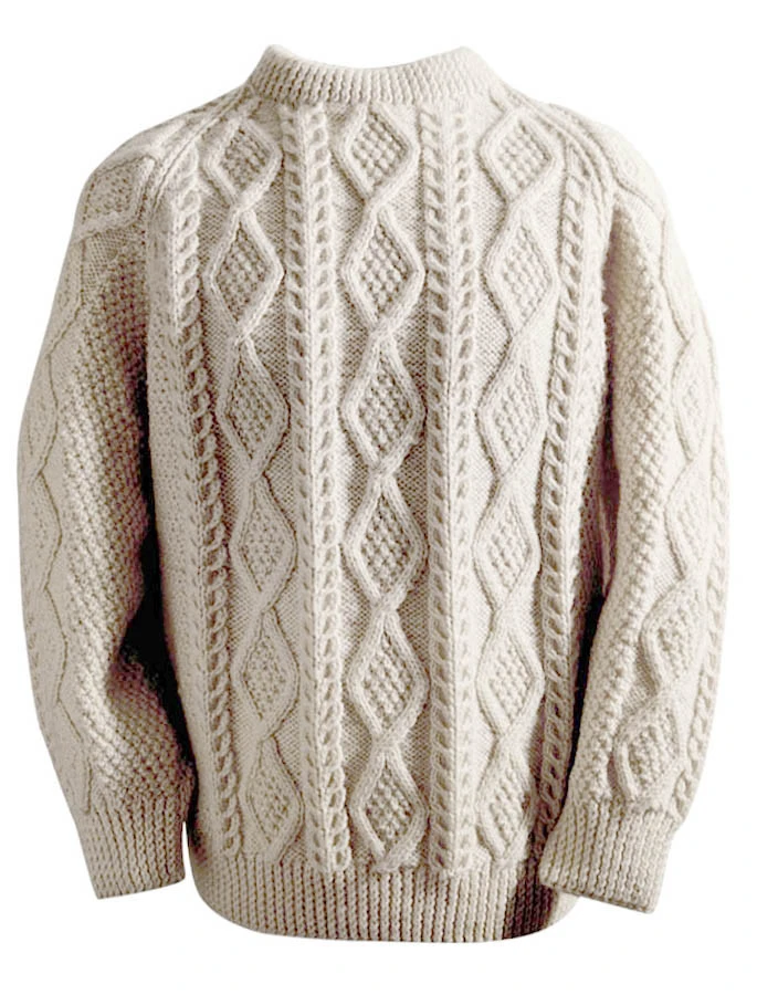 The hand knit Power sweater has a moss filled diamond as the central panel, flanked by alternating link and moss-filled diamond stitches on either side. The diamond represents wealth, and the link symbolises the unbroken chain between the Irish who emigrate and those who remain at home. This beautiful Aran sweater has been hand knitted in the traditional báinín (pronounced ‘baw neen’) colour, the natural white of the wool. It comes to you complete with a clan history and crest. It is made of 100% pure new wool, is water repellent and breathable. It has been hand crafted in the traditional Irish style, and, with care, will last a lifetime.
