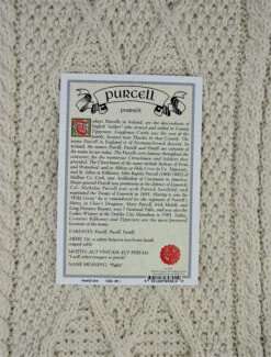The Purcell Clan Aran Throw is a precious gift for any home wherein Purcell heritage proudly resides & will be cherished by families of the Purcell name for generations to come. Lovingly crafted from the finest 100% soft new wool, this Aran throw (measuring 64″ X 40″) has been created following the unique Purcell Clan Aran pattern.