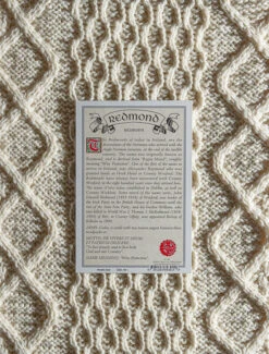 The Redmond Clan Aran Throw is a precious gift for any home wherein Redmond heritage proudly resides & will be cherished by families of the Redmond name for generations to come. Lovingly crafted from the finest 100% soft new wool, this Aran throw (measuring 64″ X 40″) has been created following the unique Redmond Clan Aran pattern.
