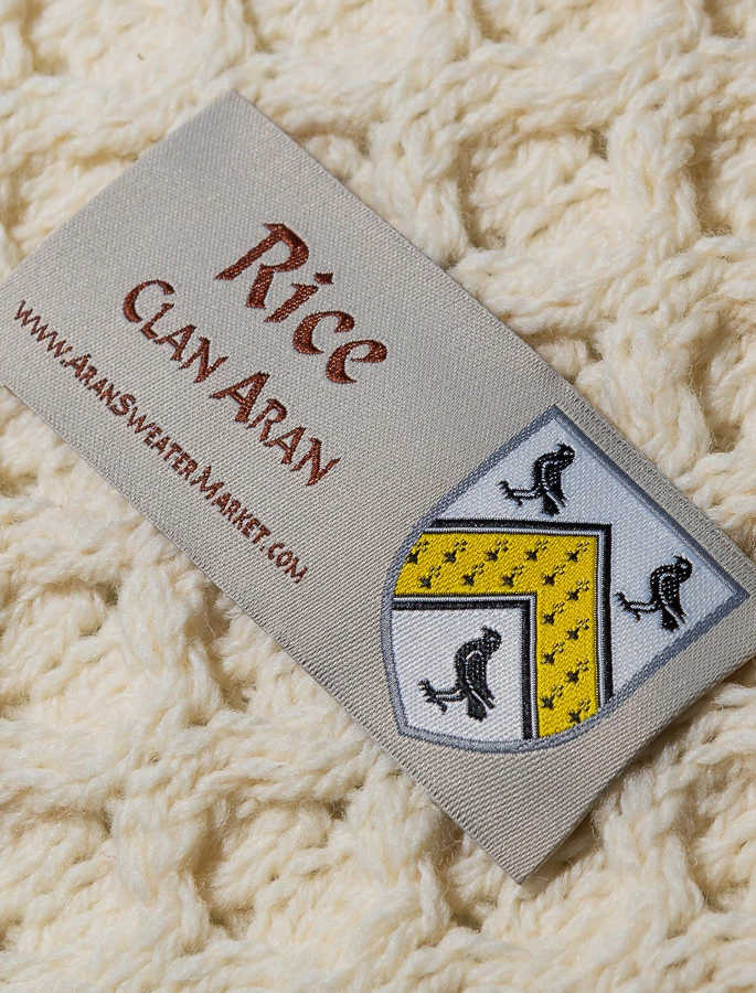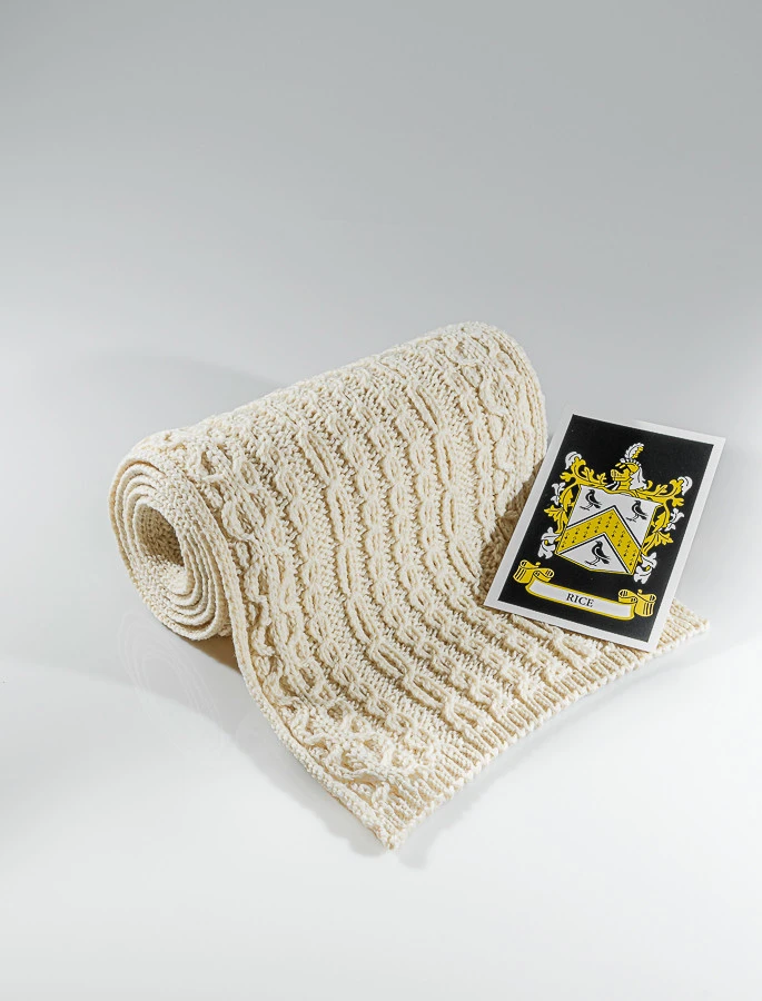 The Rice Clan Aran Scarf is a wonderful item of Rice heritage which will be cherished by the wearer for generations to come. Lovingly crafted from the finest 100% soft new wool, this Aran wool scarf has been created following the unique Rice Clan Aran pattern.