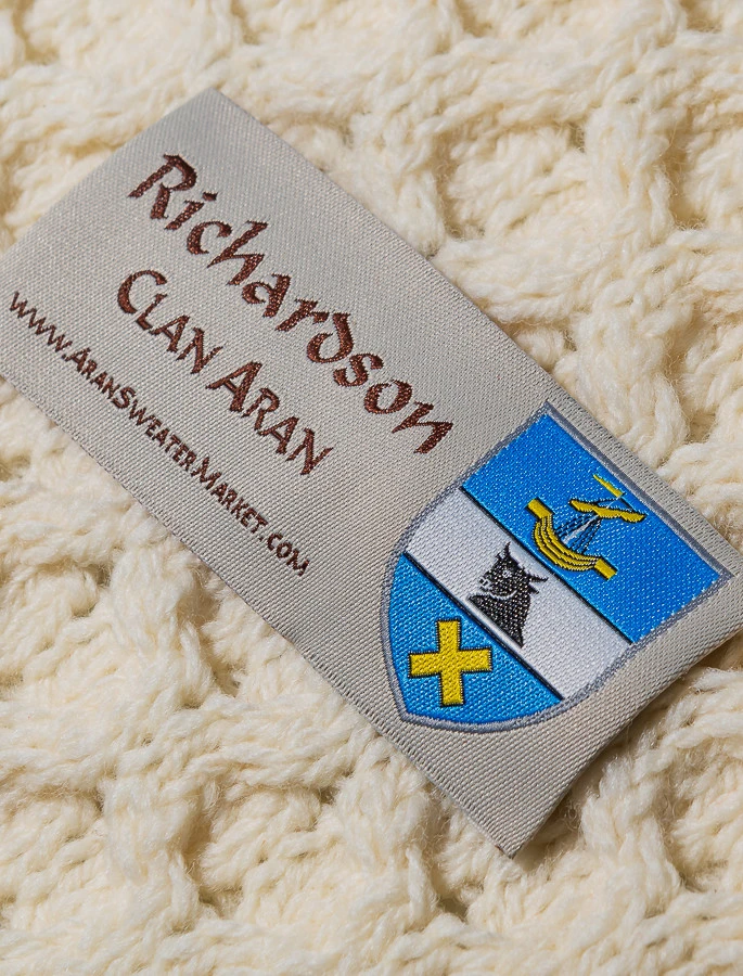 The Richardson Clan Aran Throw is a precious gift for any home wherein Richardson heritage proudly resides & will be cherished by families of the Richardson name for generations to come. Lovingly crafted from the finest 100% soft new wool, this Aran throw (measuring 64″ X 40″) has been created following the unique Richardson Clan Aran pattern.