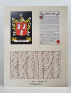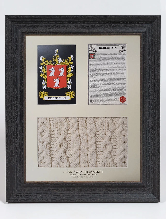 The Robertson Clan Aran & History Display is a wonderful item of Robertson heritage which can be proudly displayed in your home or place of work to demonstrate the pride your have in your Robertson name.