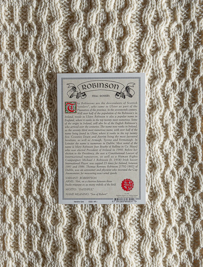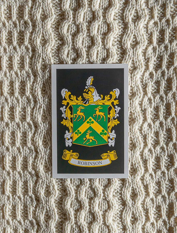 The Robinson Clan Aran Throw is a precious gift for any home wherein Robinson heritage proudly resides & will be cherished by families of the Robinson name for generations to come. Lovingly crafted from the finest 100% soft new wool, this Aran throw (measuring 64″ X 40″) has been created following the unique Robinson Clan Aran pattern.