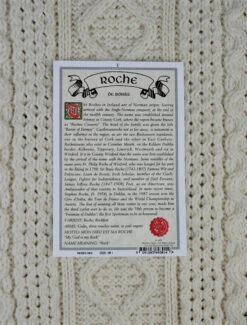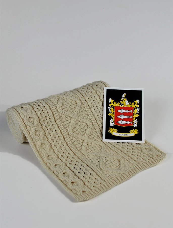 The Roche Clan Aran Scarf is a wonderful item of Roche heritage which will be cherished by the wearer for generations to come. Lovingly crafted from the finest 100% soft new wool, this Aran wool scarf has been created following the unique Roche Clan Aran pattern.ย