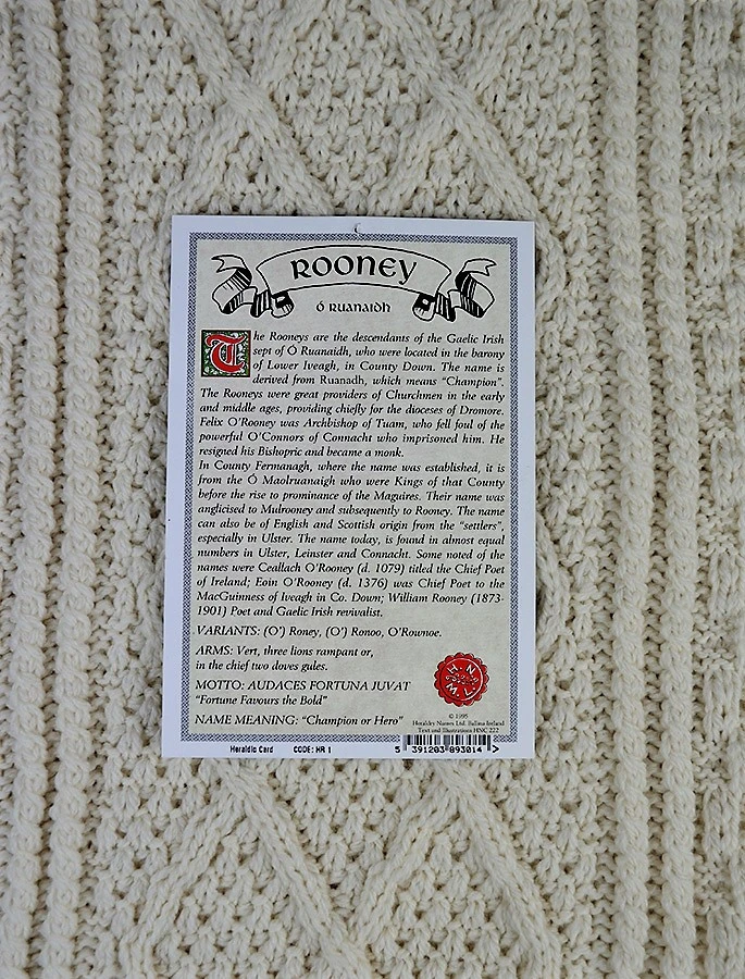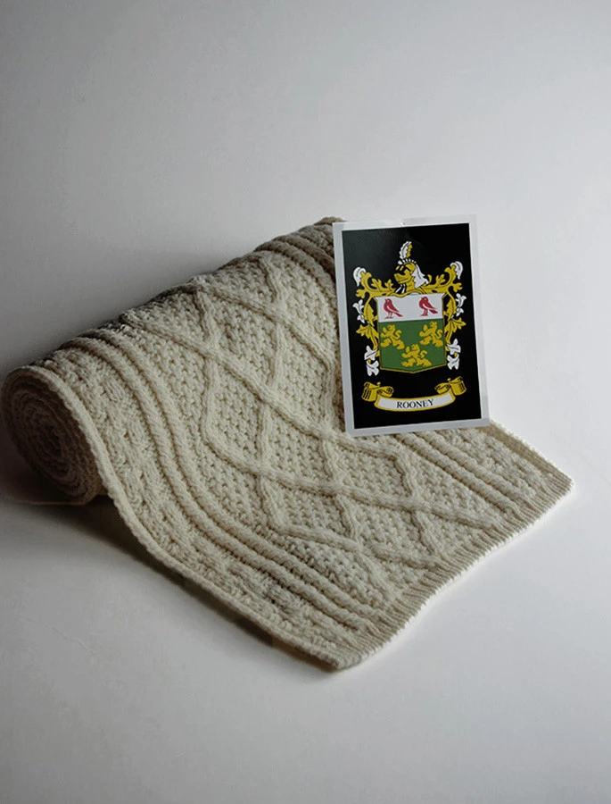 The Rooney Clan Aran Scarf is a wonderful item of Rooney heritage which will be cherished by the wearer for generations to come. Lovingly crafted from the finest 100% soft new wool, this Aran wool scarf has been created following the unique Rooney Clan Aran pattern.ย