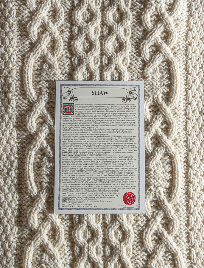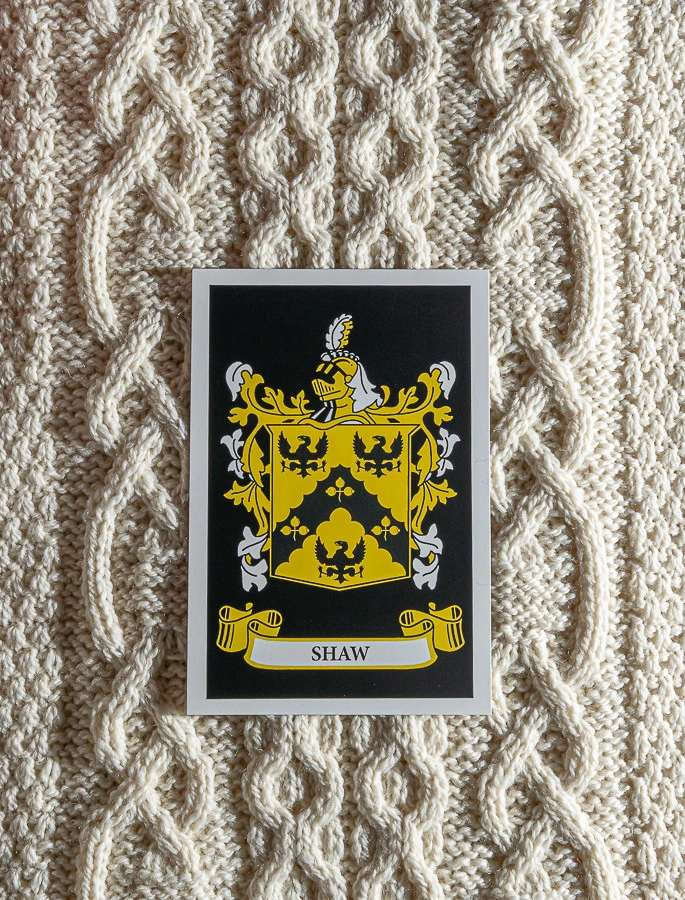 The Shaw Clan Aran Throw is a precious gift for any home wherein Shaw heritage proudly resides & will be cherished by families of the Shaw name for generations to come. Lovingly crafted from the finest 100% soft new wool, this Aran throw (measuring 64″ X 40″) has been created following the unique Shaw Clan Aran pattern.