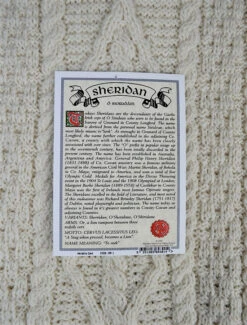 The Sheridan Clan Aran Throw is a precious gift for any home wherein Sheridan heritage proudly resides & will be cherished by families of the Sheridan name for generations to come. Lovingly crafted from the finest 100% soft new wool, this Aran throw (measuring 64″ X 40″) has been created following the unique Sheridan Clan Aran pattern.