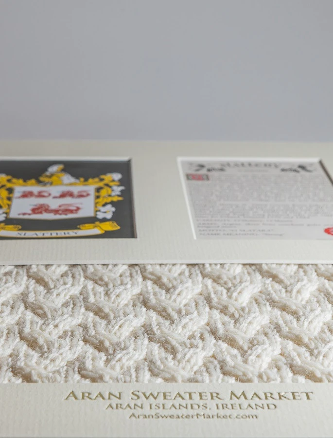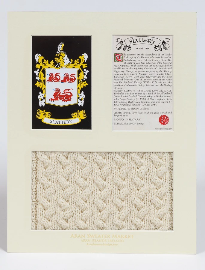 The Slattery Clan Aran & History Display is a wonderful item of Slattery heritage which can be proudly displayed in your home or place of work to demonstrate the pride your have in your Slattery name.