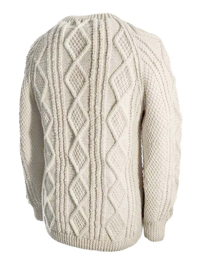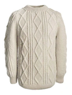 The hand knit Smith sweater comprises cable diamond and moss stitches. The diamonds symbolise a wish for wealth, the cables represent good luck and the moss symbolises nature. This beautiful hand knitted Aran sweater has been hand knitted in the traditional báinin (pronounced ‘baw neen’) colour, the natural white of the wool. It comes to you complete with a Clan history and crest. It is made of 100% pure new wool, is water repellent and breathable. It has been hand crafted in the traditional Irish style, and with care, will last a lifetime.