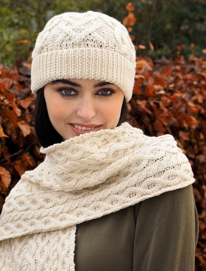 Our Super Soft Heart Design Aran Scarf is crafted with the softest of Merino Wool and features the heart design Aran Pattern throughout.