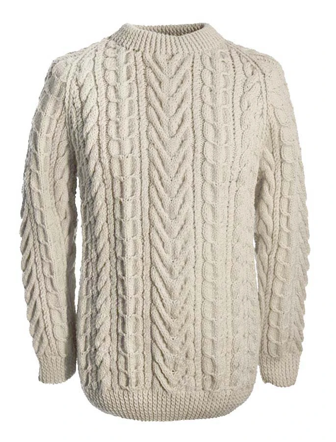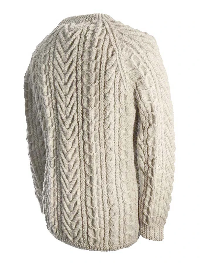 The hand knit Twomey sweater incorporates cable, link and braid stitches. The cables symbolise a wish for good luck while the link stitches represent the unbroken chain between the Irish who emigrate and those who remain at home. This beautiful Aran sweater has been hand knitted in the traditional báinín (pronounced ‘baw neen’) colour, the natural white of the wool. It comes to you complete with a clan history and crest. It is made of 100% pure new wool, is water repellent and breathable. It has been hand crafted in the traditional Irish style, and, with care, will last a lifetime.