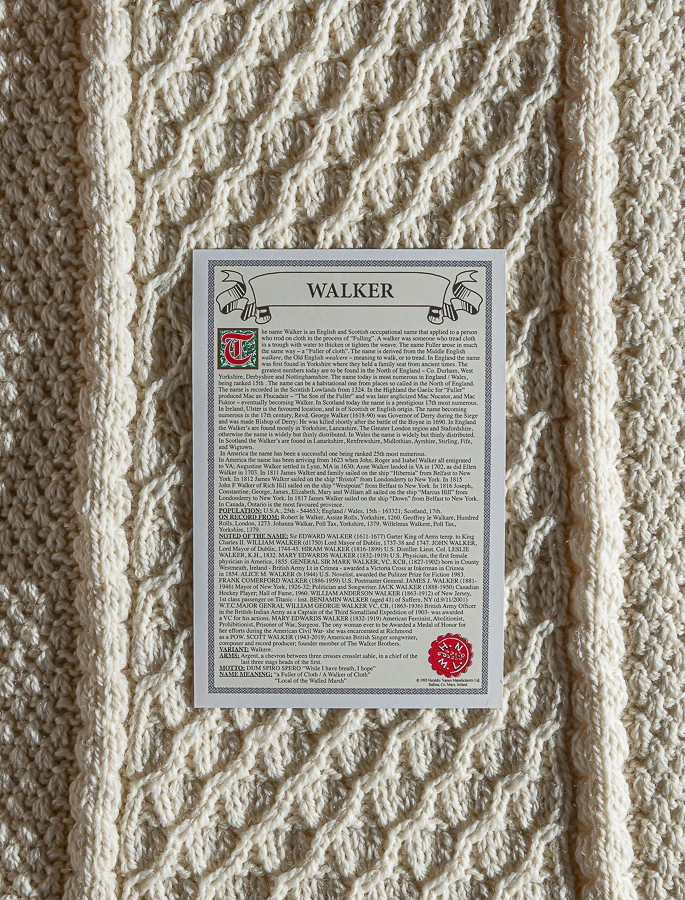 The Walker Clan Aran Throw is a precious gift for any home wherein Walker heritage proudly resides & will be cherished by families of the Walker name for generations to come. Lovingly crafted from the finest 100% soft new wool, this Aran throw (measuring 64″ X 40″) has been created following the unique Walker Clan Aran pattern.