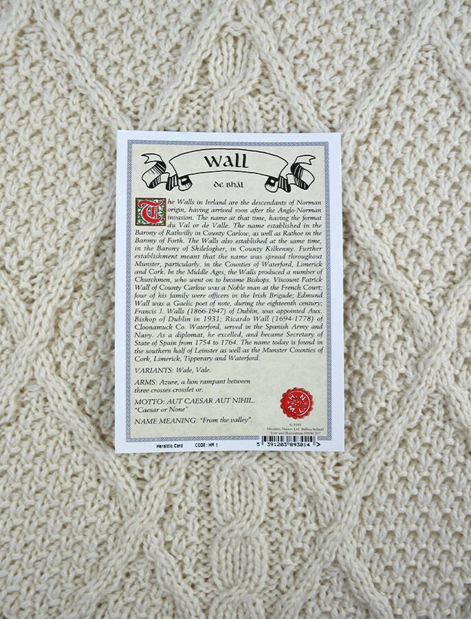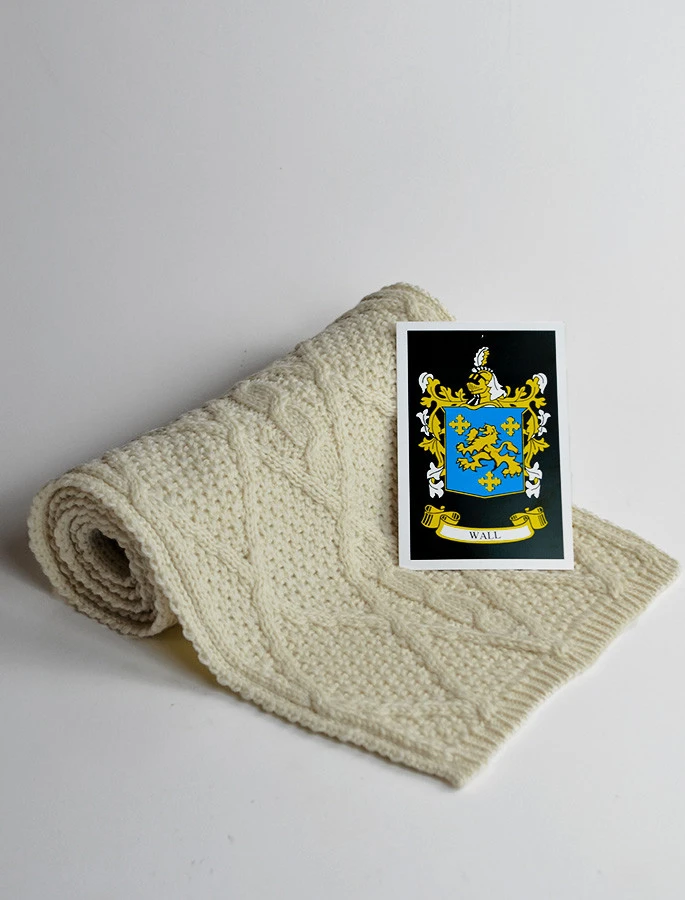 The Wall Clan Aran Scarf is a wonderful item of Wall heritage which will be cherished by the wearer for generations to come. Lovingly crafted from the finest 100% soft new wool, this Aran wool scarf has been created following the unique Wall Clan Aran pattern.