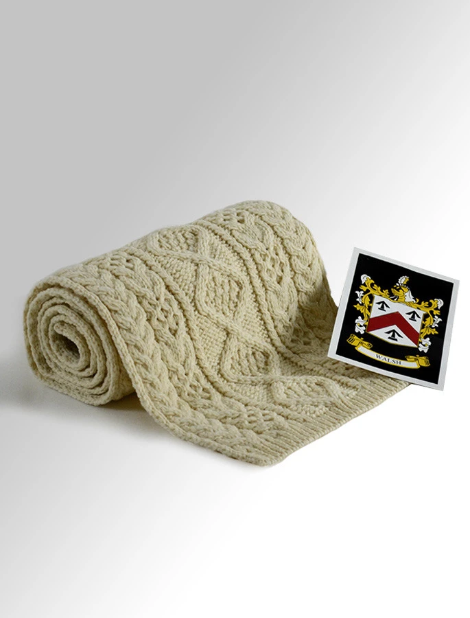 The Walsh Clan Aran Scarf is a wonderful item of Walsh heritage which will be cherished by the wearer for generations to come. Lovingly crafted from the finest 100% soft new wool, this Aran wool scarf has been created following the unique Walsh Clan Aran pattern