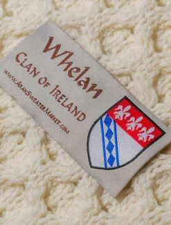 The hand knit Whelan sweater has a link centre stitch, flanked by moss filled zig-zags and link stitches on either side. The link stitch represents the unbroken chain between the Irish who have emigrated and those who remain at home, and the zig-zags symbolise the ups and downs of marriage. This beautiful Aran sweater has been hand knitted in the traditional báinín (pronounced ‘baw neen’) colour, the natural white of the wool. It comes to you complete with a clan history and crest. It is made of 100% pure new wool, is water repellent and breathable. It has been hand crafted in the traditional Irish style, and, with care, will last a lifetime.