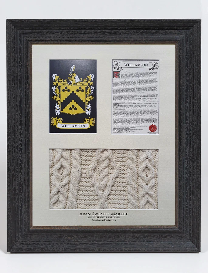 The Williamson Clan Aran & History Display is a wonderful item of Williamson heritage which can be proudly displayed in your home or place of work to demonstrate the pride your have in your Williamson name.