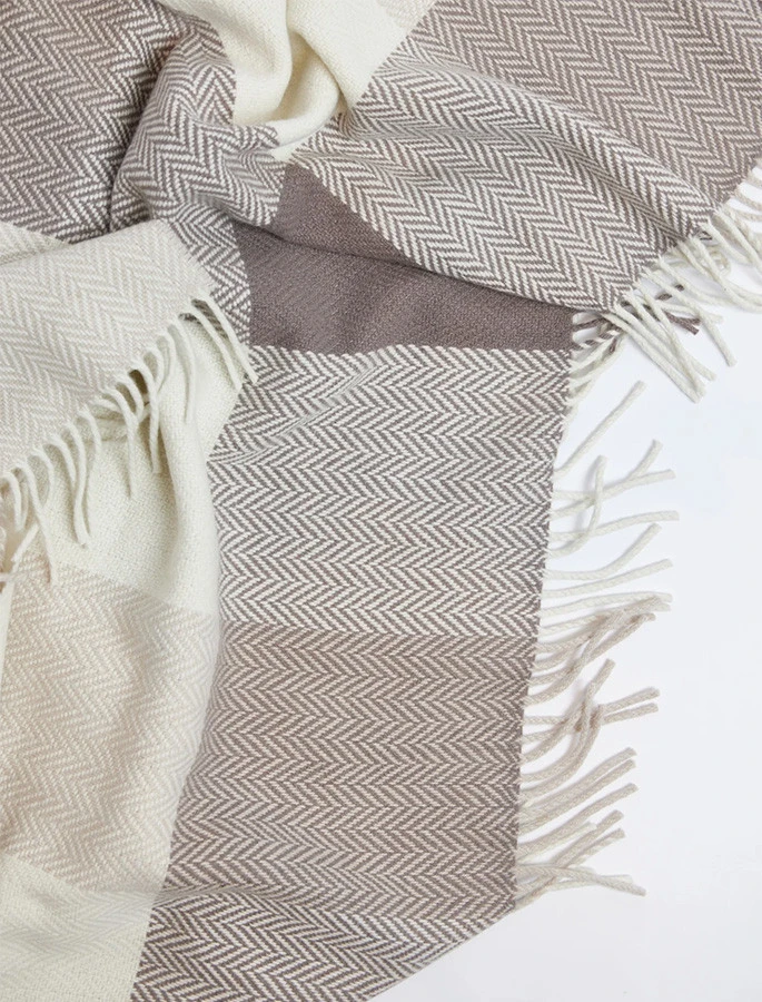 Designed in a neutral palette of grey and bone and crafted from a blend of cashmere and lambswool and finished with a rolled fringe.
